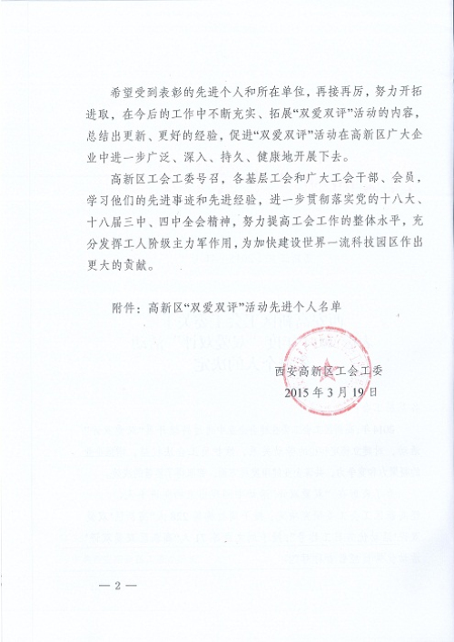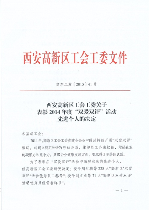 熱烈祝賀副總經(jīng)理張玉軍被評(píng)為2014年度“雙愛雙評(píng)”活動(dòng)優(yōu)秀經(jīng)營(yíng)者,劉莉被評(píng)為優(yōu)秀企業(yè)員工